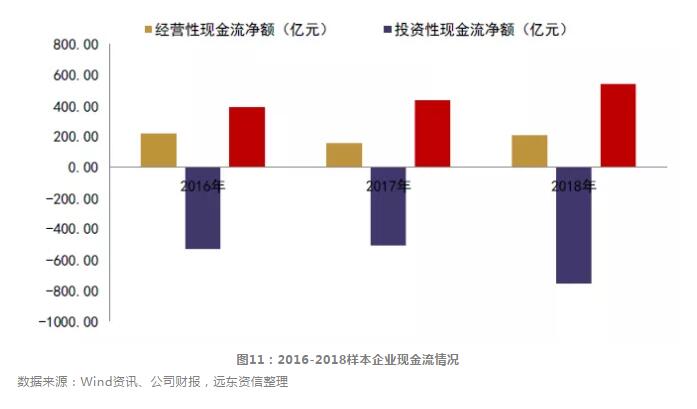 從投資性現金流情況來看,固定資產投資目前仍是水務行業的重點,在政策推動下樣本企業購建固定資產、無形資產和其他長期資產支付的現金近年來快速增長,除此之外,近年來水務行業并購頻繁,并購支出也是水務企業一大資金需求。由于水務企業經營性現金流較為充裕,因此大部分企業在現金儲備充裕時選擇進行短期理財投資,該因素也造成了較大規模的投資性現金收支,但對投資性現金流量凈額影響相對較小。2016、2017年2018年,樣本企業投資活動產生的現金流量凈額分別為-531.73億元、-507.28億元和-753.83億元,呈持續大額凈流出狀態。