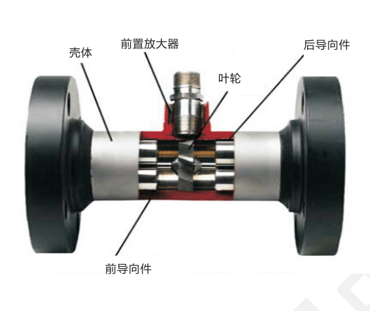 渦輪流量計的工作原理如下圖所示,當被測流體流過傳感器時,在流體作用下,葉輪受力旋轉,其轉速與管道平均流速成正比,葉輪的轉動周期地改變磁電轉換器的磁阻值。檢測線圈中的磁通隨之發生周期性變化,產生周期性的感應電勢,即電脈沖信號,經過放大調制后,輸出標準信號。