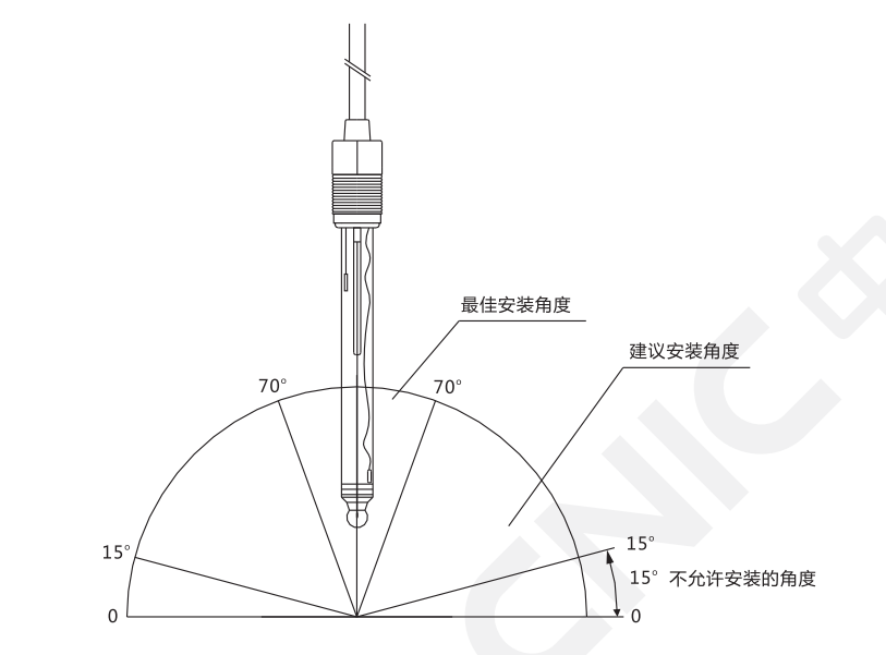 1、安裝時不要將電極顛倒。傾度角至少與水平方向相夾15°,傾度角不允許更小,因為較小的傾度角會在玻璃半球中形成氣泡墊,這樣會削弱內部電極PH膜的濕度。