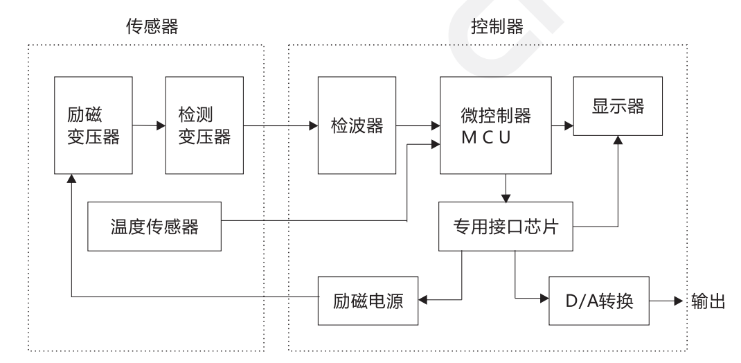 CN162是電磁感應式電導儀,由MCU在軟件控制下產生的交流電壓驅動浸沒在被測溶液中的勵磁變壓器,在被測溶液中產生感生電流,該感生電流又在檢測變壓器中產生一個很大的交變感生電勢,該感生電勢與被測溶液的電導率成正比。將這個感生電勢檢波后由MCU采樣,同時溫度傳感器也將溶液溫度信號送至MCU采樣和依照內存的該溶液的特性曲線,進行高精度的(每0.5℃校正一次)溫度補償運算和非線性校正運算。計算后得到的濃度數值通過顯示器就地顯示出來,同時經D/A轉換電路變成標準電流信號遠傳輸出。