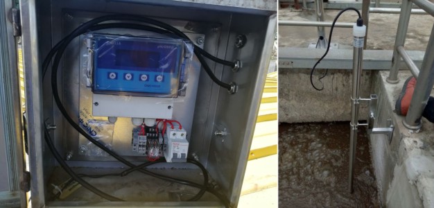 在污水進、出口均設有pH分析儀,進水處配置pH計的目的是方便工藝人員針對進水水質采取相應的控制調節手段,以滿足后續處理的要求。在出水處設置pH計的目的是反映處理的效果,方便廠部和政府部門對污水廠運行狀態監管。pH計的基本工作原理是用電位法測量溶液的酸堿度,插人待測溶液的測量電極與具有恒定電位的參比電極之間的電勢差與溶液pH值之間有固定的函數關系,由此通過測量電勢得出pH值。