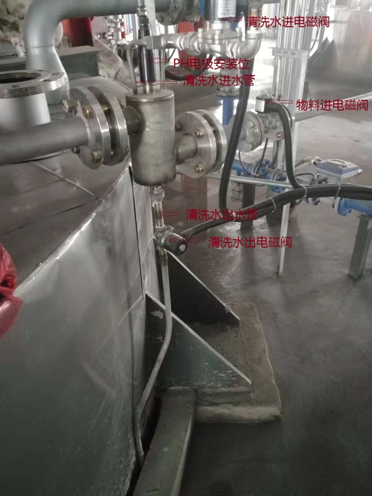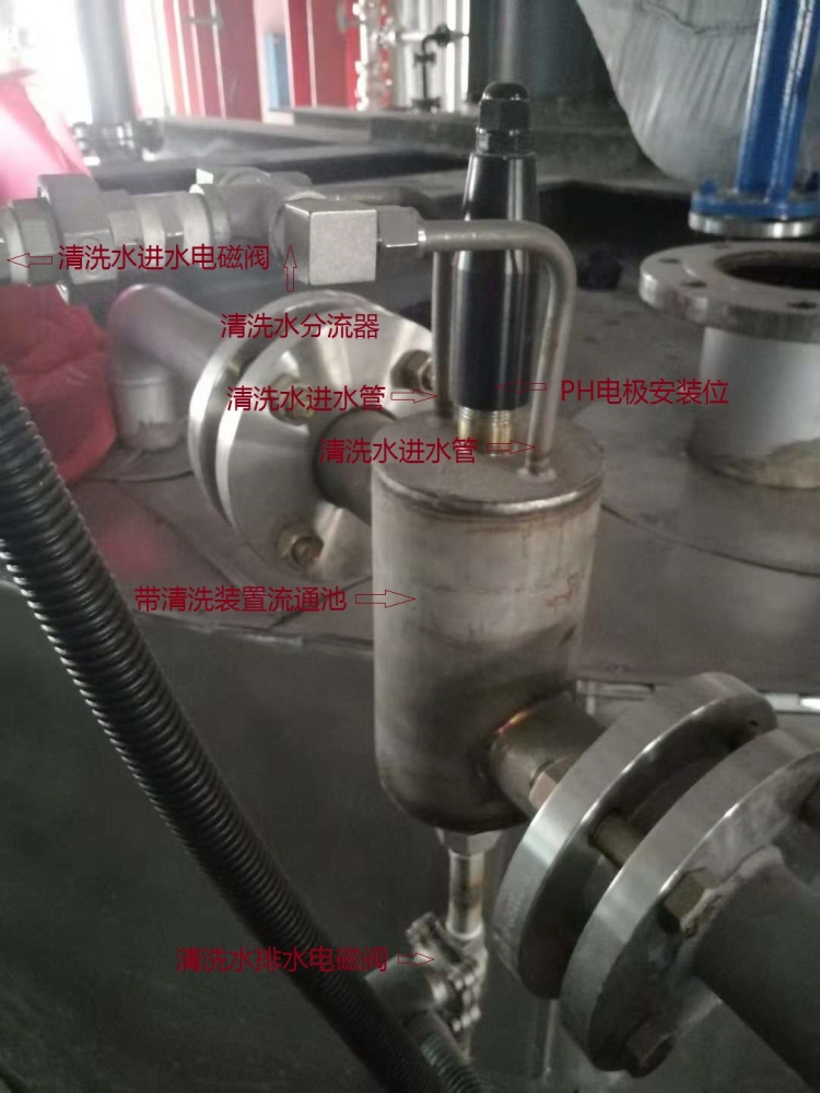 通過特別設計的流通池,在設定的時間利用沖洗泵抽取清水對PH傳感器進行沖洗,沖洗過程中利用電磁閥控制物料管路和沖洗管路的關閉,這樣一方面既能保證測量的準確度并減少傳感器的損耗,增長了傳感器的使用壽命,同時不會讓清洗水流入到物料內。