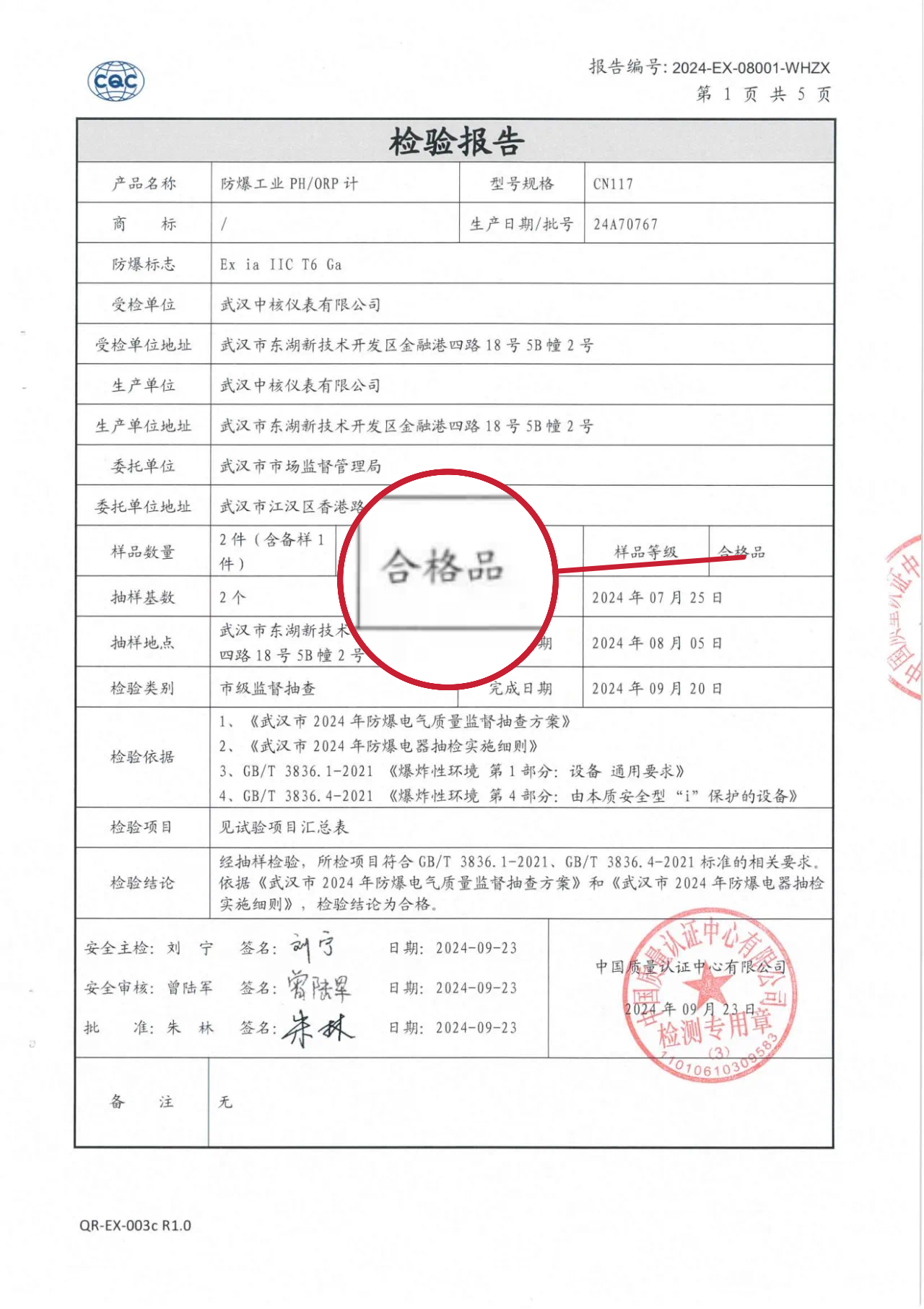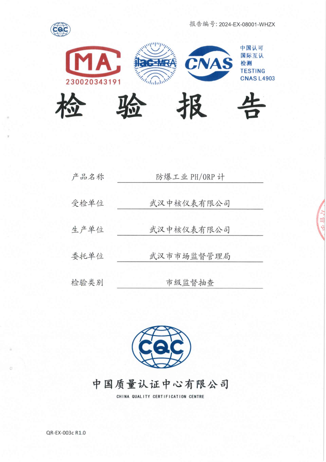 按照國家市場監督管理總局要求,本次抽檢采取“隨機抽樣”形式,重點抽取本地區產業聚集、消費使用量大的產品,以切實反映武漢地區工業產品總體質量狀況。中核儀表防爆工業pH/ORP計在本次抽檢之列,并由中國質量認證中心承檢。以下為抽檢結果展示,測定樣品為合格品。