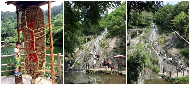我們還體驗了景區設計的攀水瀑布,穿上景區特備的草鞋,從瀑流里向上攀登。百米攀道有規律地安置著梯坎,兩邊拉著鐵鎖鏈的扶欄,雖無驚險之處,但溪水從腳下潺潺而流,清涼又刺激,頗有新意。