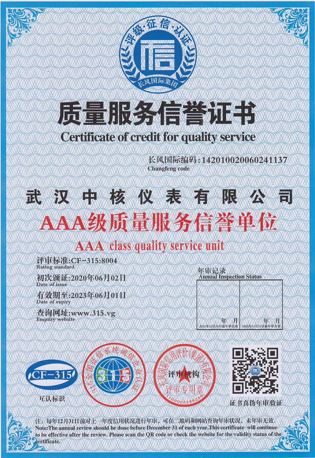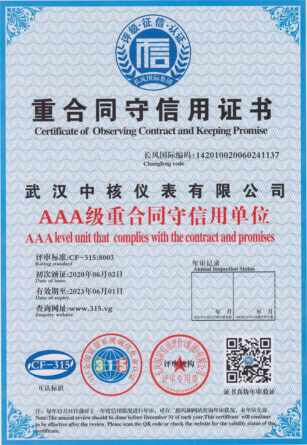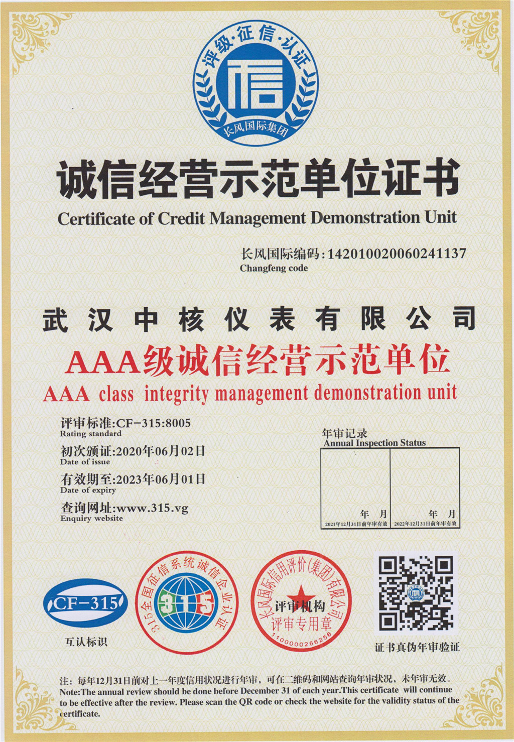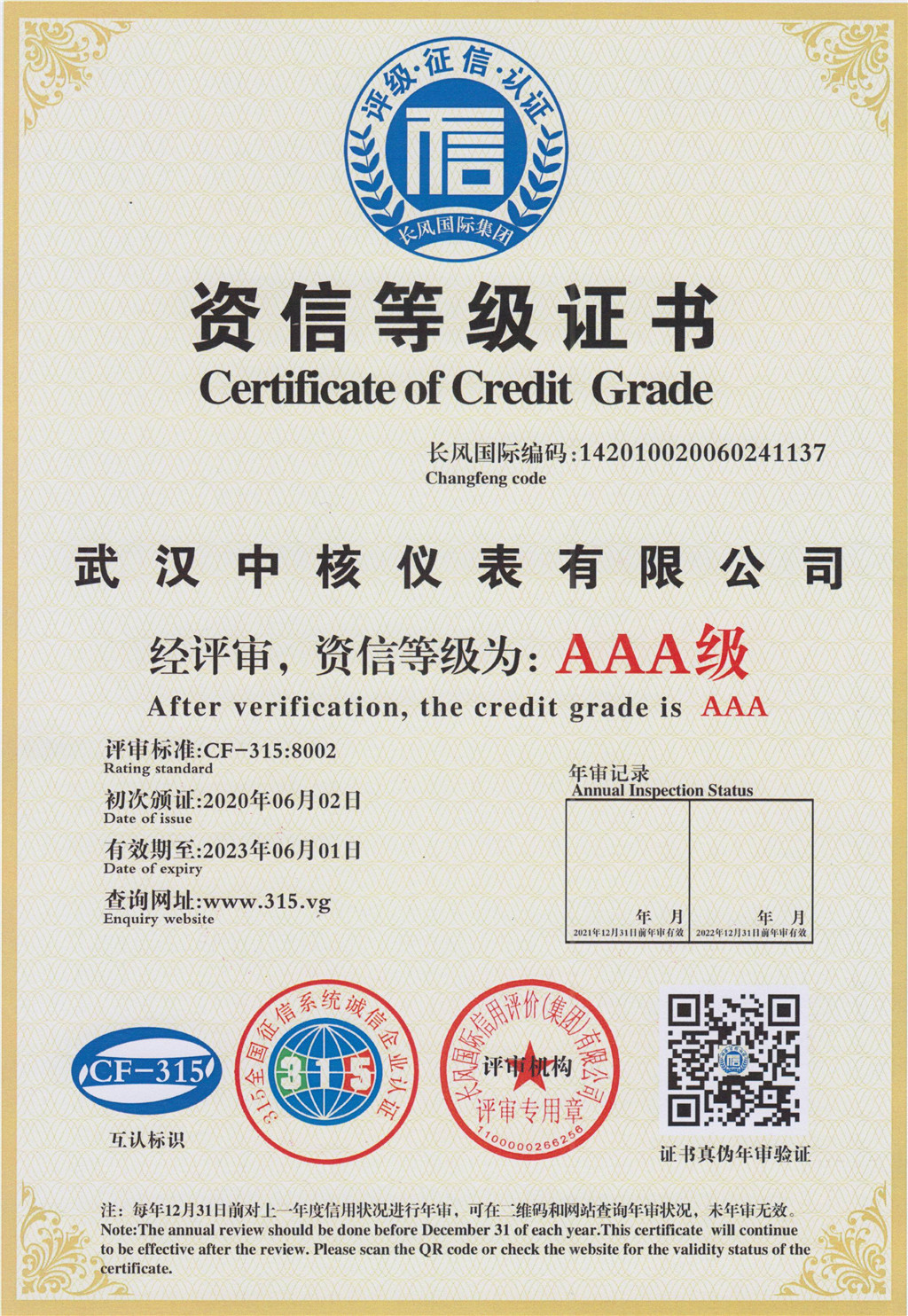 “AAA企業信用等級證書”代表了企業信用評定的最高級別,此次在企業信用等級評價中獲得AAA認證,是對武漢中核儀表有限公司實力和信譽的高度認可,是公司在健康發展過程中獲得的又一重要里程碑,這一資質對企業后續發展具有深遠的意義。