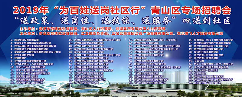 為了更好的解決青山區居民待崗就業問題,緩解居民生活壓力,武漢市勞動就業管理局,青山區人力資源局,武鋼集團有限公司人力資源部聯合多家知名大型企業將舉辦一場2019年“為百姓送崗社區...